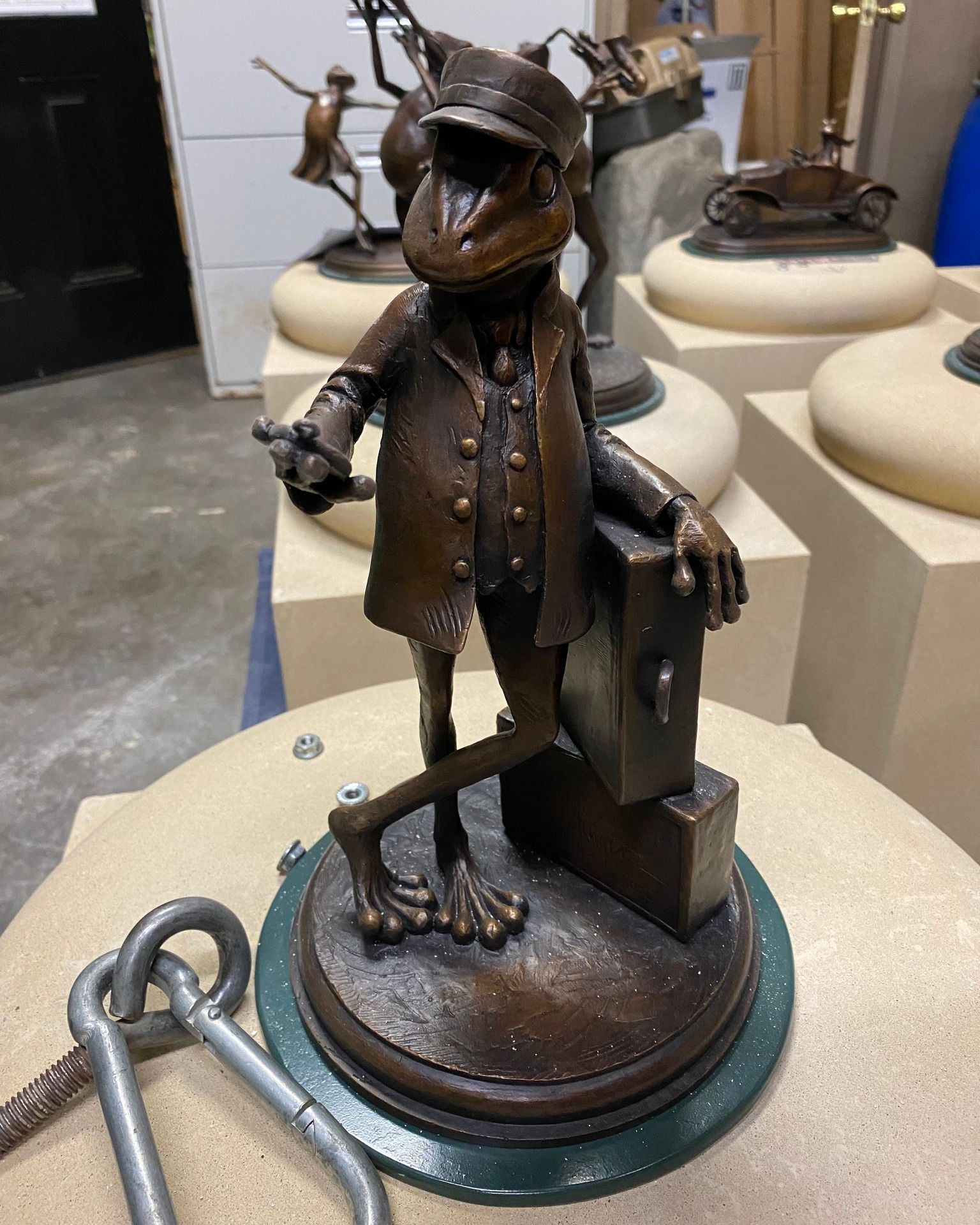 Tiny toad trying to balance a very large hammer